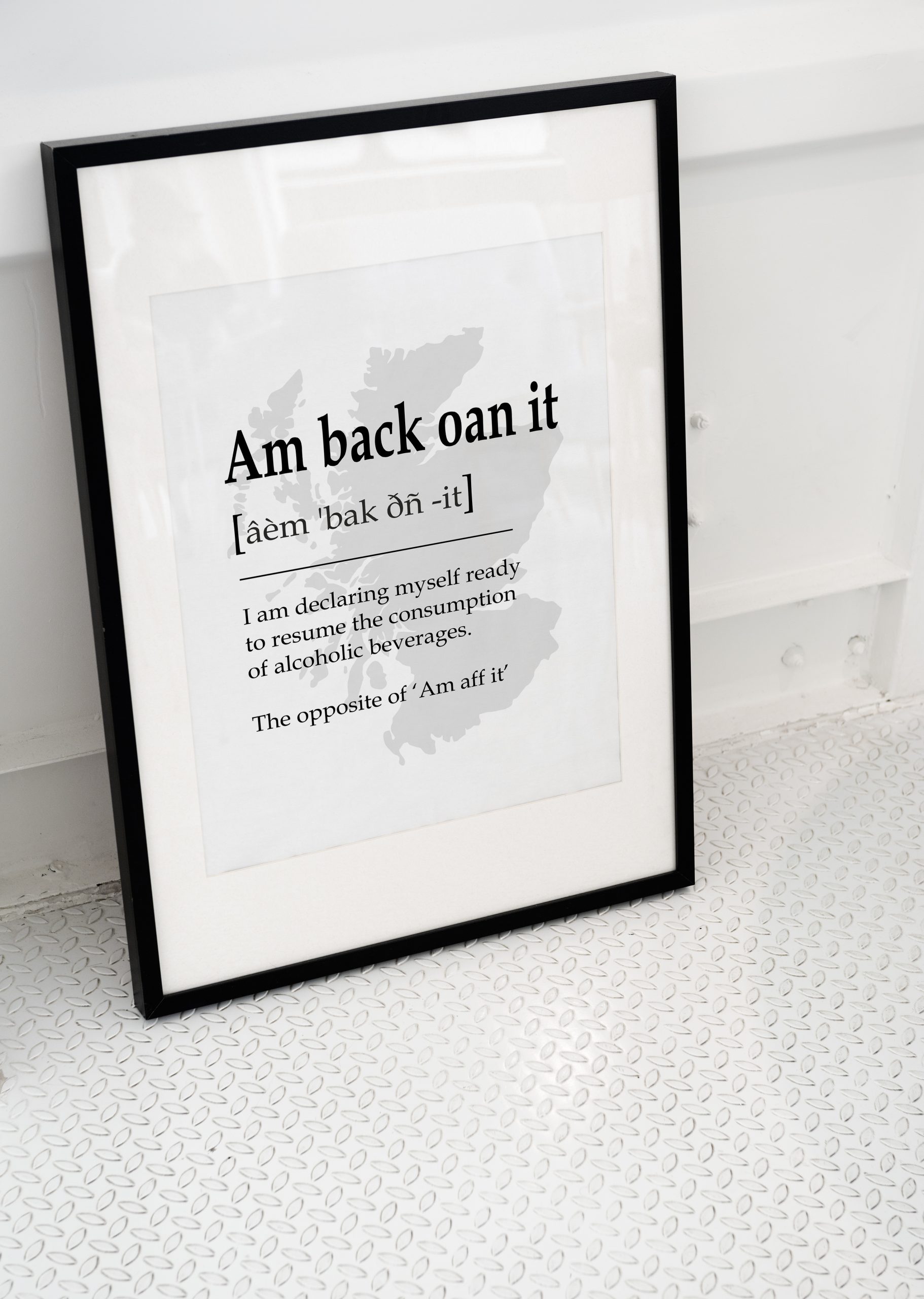 Am back oan it Scottish UNFRAMED PRINT Fun Scots Scotland Slang Definition Room Wall Art
