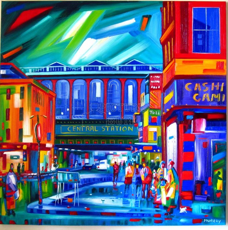 Quality print of an oil painting by Raymond Murray, depicting the bridge at Glasgow’s central Station from Argyle St.