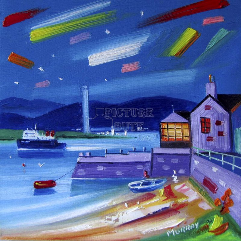 Giclee print of a night-time view of the iconic pier at Craigmore, Isle of Bute, Scotland. The ferry is crossing in the distance