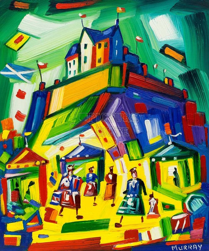 Giclee print of a distinctive oil painting of Edinburgh Castle by Raymond Murray. He captures the hubbub of the locals beneath the historic hill.