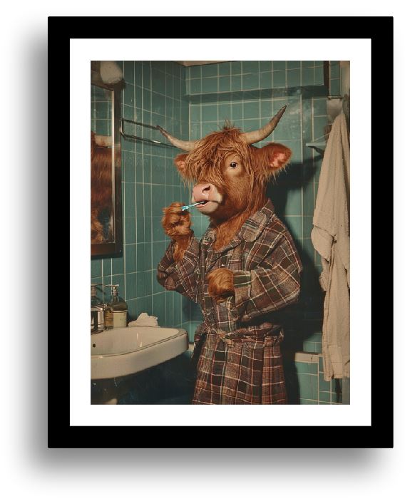Add a playful dose of nostalgia and humor to your space with this delightful Highland cow print, brushing its teeth in a perfectly retro bathroom setting! Perfect for anyone who appreciates quirky art, animal lovers, or fans of mid-century design, this print is a fun conversation starter that adds character to your walls. The high-quality print brings out every detail, from the cow’s expressive face to the vintage decor. It’s a unique and charming way to enhance your home, bathroom, or office. Give your space a fresh twist with this fun-loving cow—grab your print today and brush up on your decor style!