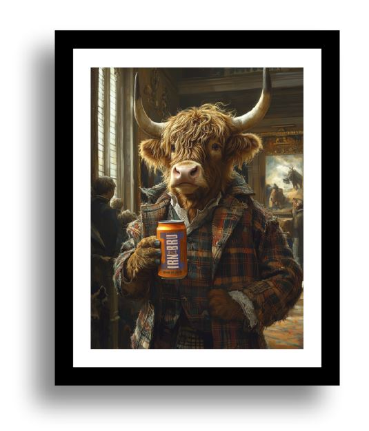 Introducing our delightful print featuring a Highland cow enjoying a famous fizzy drink—a perfect blend of rustic charm and modern-day humor! This unique artwork captures the iconic shaggy Highland cow in a playful, human-like pose, sipping on a cup of coffee with undeniable style.