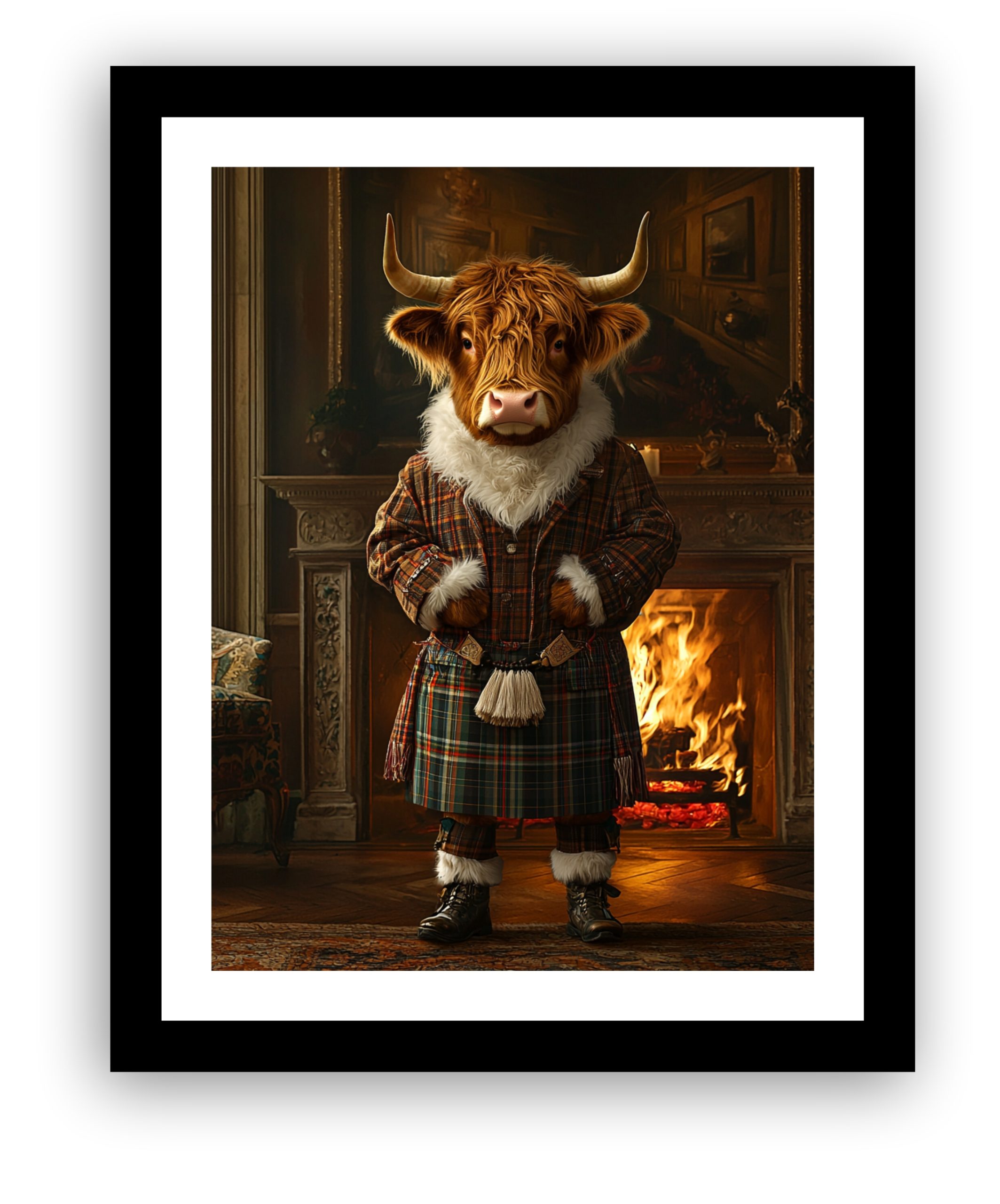 “The Highland Gentleman” – a charming and whimsical art print that brings character and warmth to any space. In this captivating scene, an anthropomorphic Highland cow, dressed in a finely tailored suit, stands proudly in front of a roaring open fire in his stately home. The setting is grand yet cozy, with rich wood paneling, elegant furniture, and a hint of old-world luxury. His posture is dignified, a true embodiment of the refined country squire, as he surveys his grand room with calm confidence.