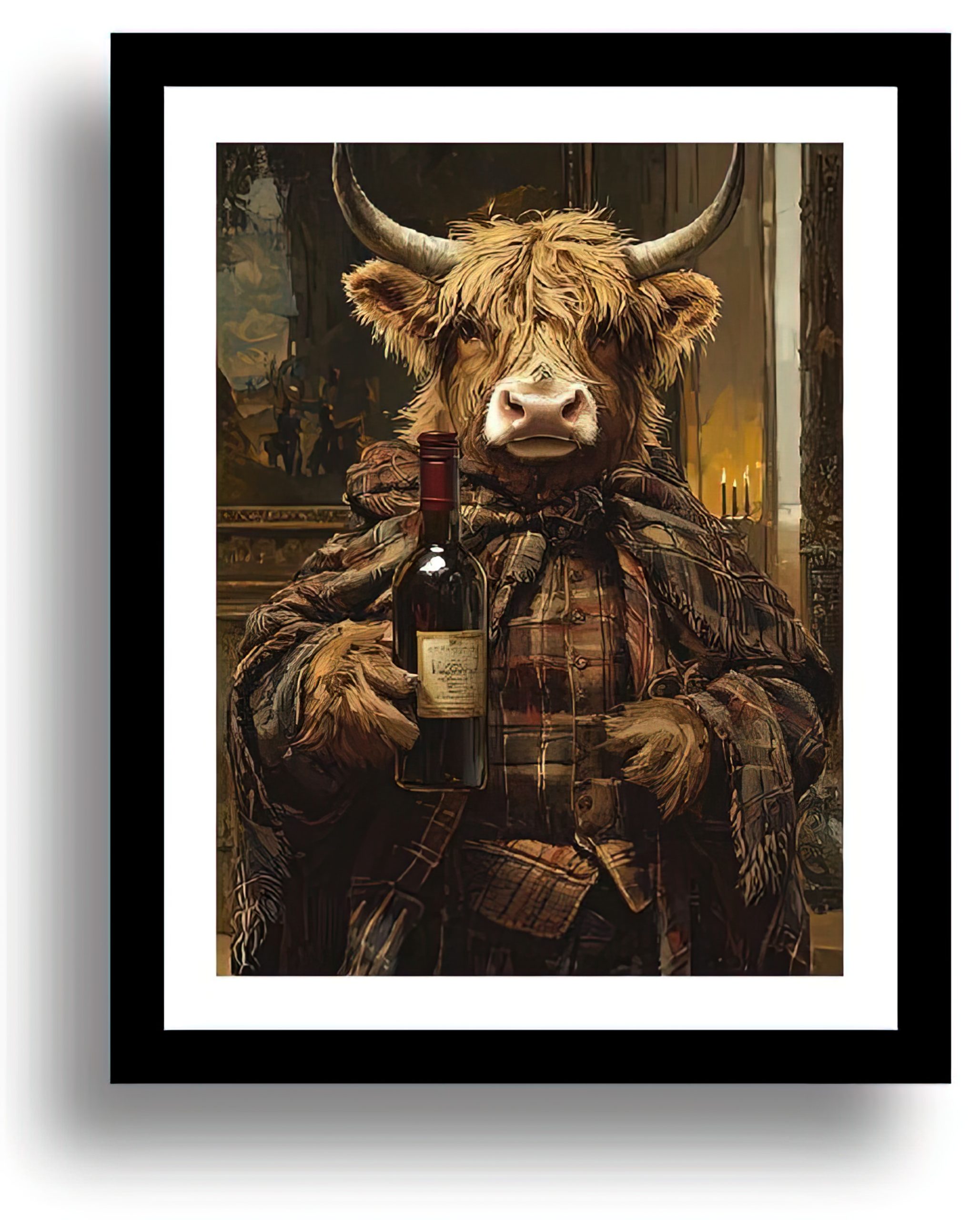 Class meets quirk in this whimsical photo print of a Highland cow, elegantly holding a bottle of fine red wine in a grand stately home setting. With its shaggy fur and horns, this sophisticated bovine exudes charm and refinement, dressed in a velvet smoking jacket and poised in front of an ornate fireplace and opulent décor. The rich details of the stately home—complete with antique furniture, oil paintings, and candlelit chandeliers—create a perfect contrast to the humorous, yet classy, cow sommelier.