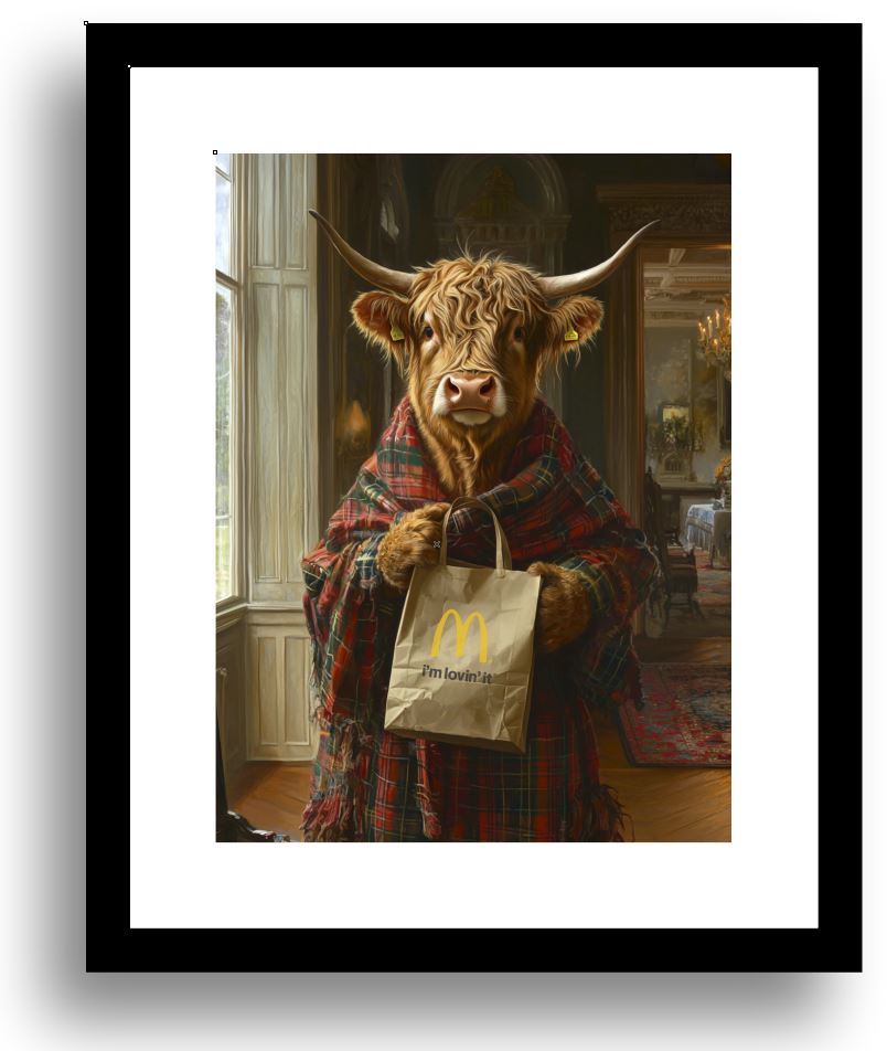 Add a playful touch of Scottish charm to your space with this whimsical art print of a dapper Highland cow dressed in tartan and clutching a brown paper McDonald’s bag. Perfect for those who love quirky art, Scottish heritage, and a cheeky nod to fast-food indulgence! This delightful piece is sure to bring smiles and start conversations wherever it’s displayed.