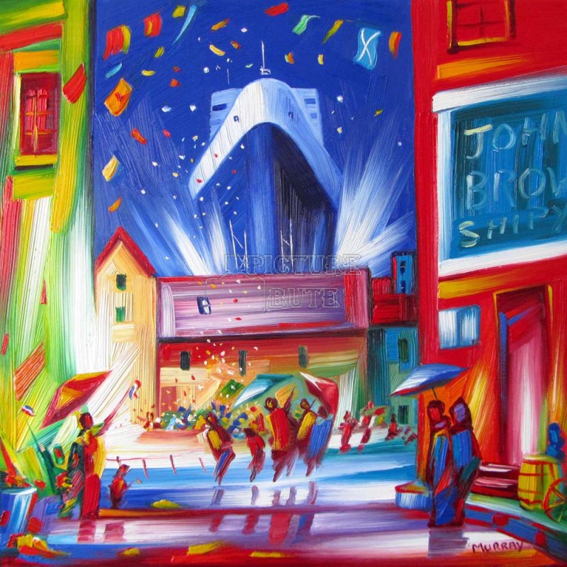 Giclee print of An exciting oil painting showing the launch of the Queen Elizabeth, the Second ship, from the banks of the river Clyde. By artist Raymond Murray.