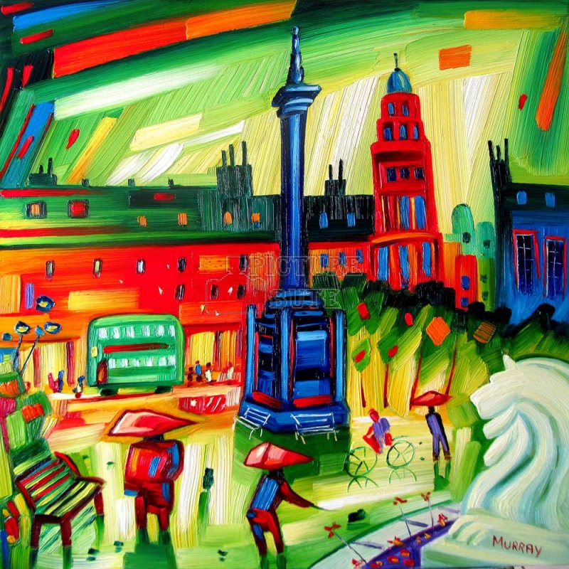Giclee print of an oil painting showing the statue of a lion at George Square in Glasgow, Scotland. By Raymond Murray