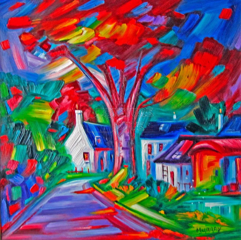 Giclee print of a oil painting by Raymond Murray is a vibrant colour explosion. It depicts the old road through the Seaside town of Largs in Scotland.